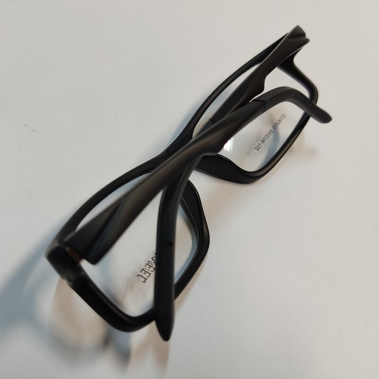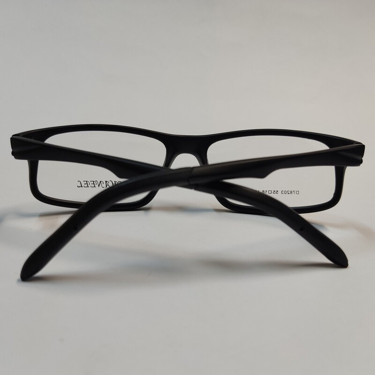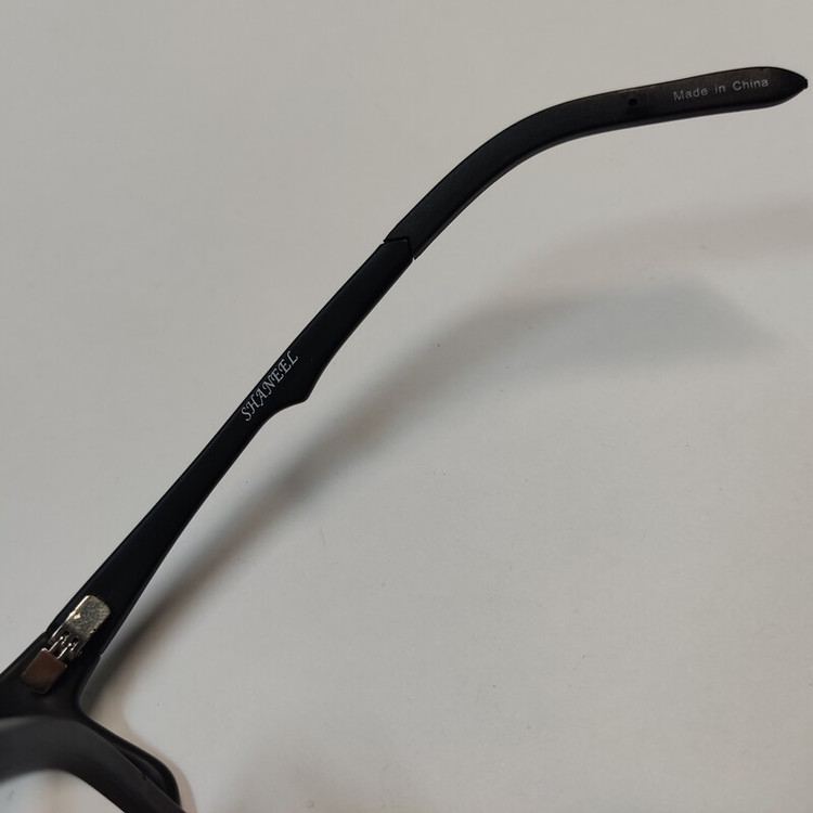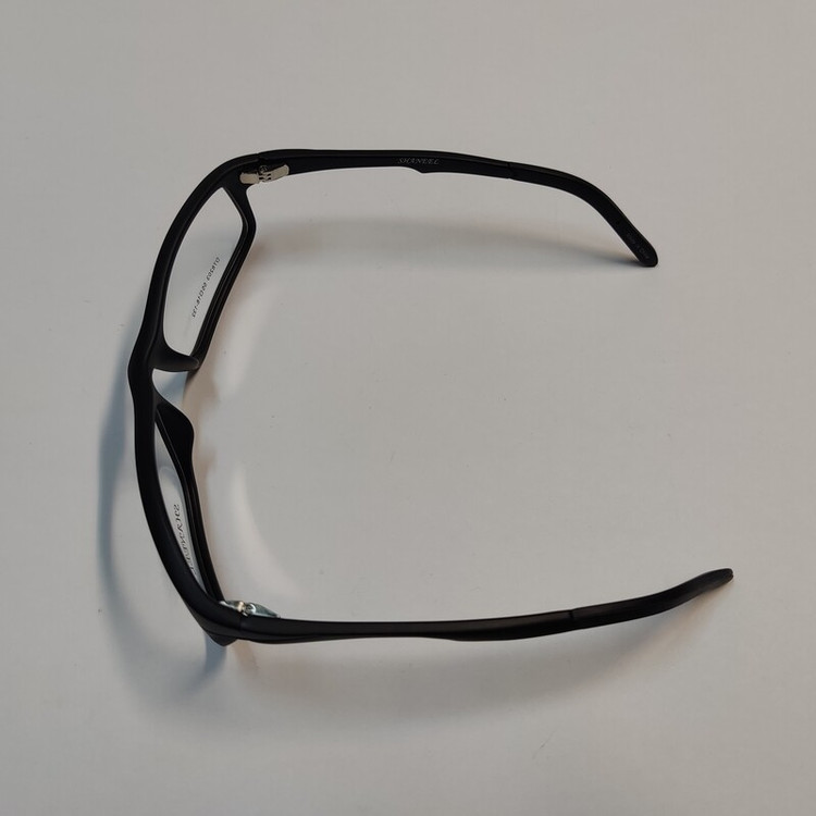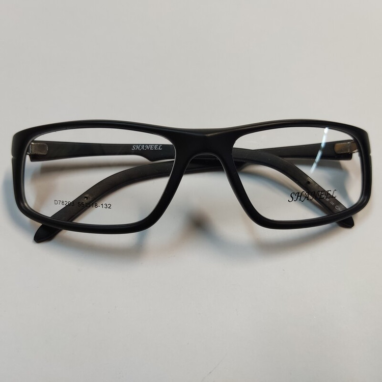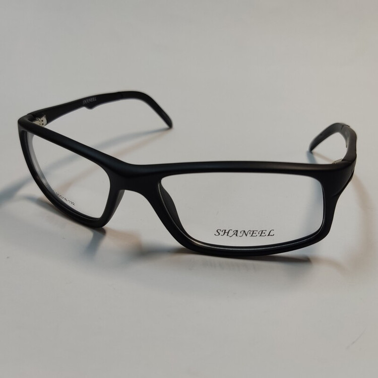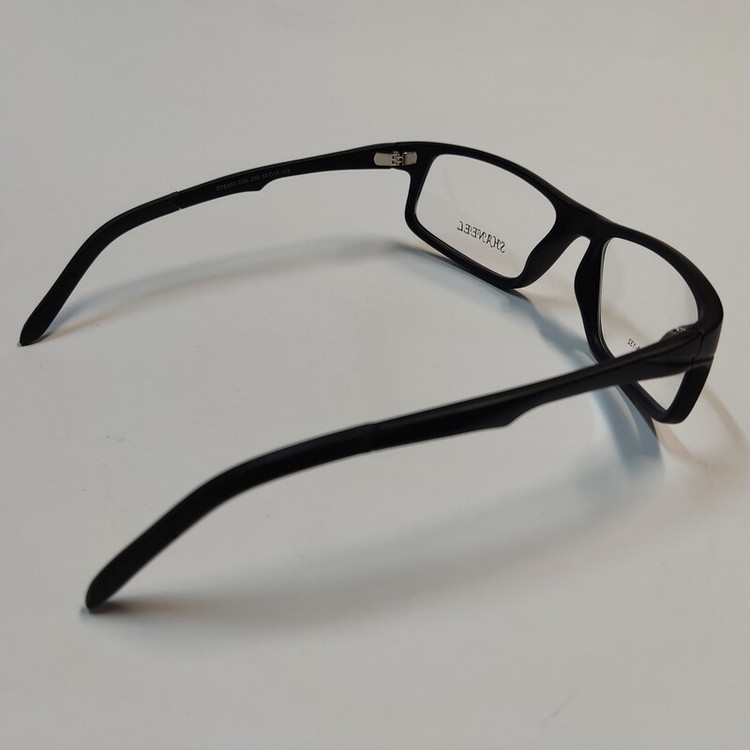 فریم عینک طبی shaneel D78203 با فریم کایوچویی مشکی مات و دسته های لولا فلزی ساده با روکش انتهای دسته(پشت گوش) نرم با سایز 55*18*132 و ارتفاع عدسی حدود 32 و قسمت جلوی فریم از دسته تا دسته در محدوده لولا 137 میباشد.