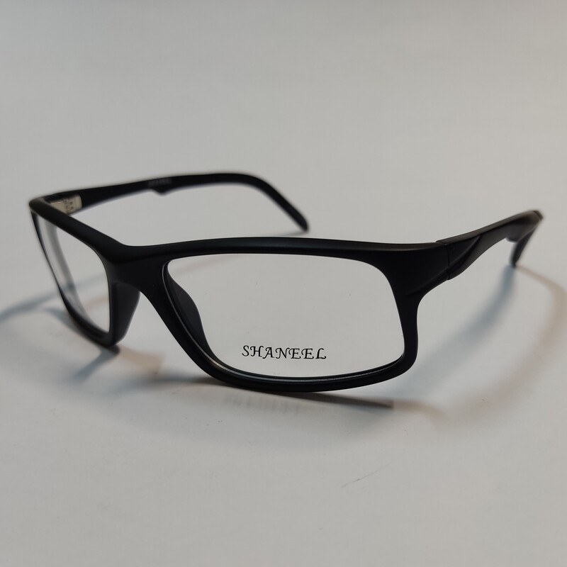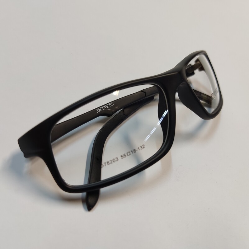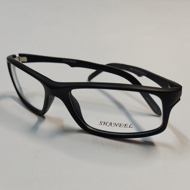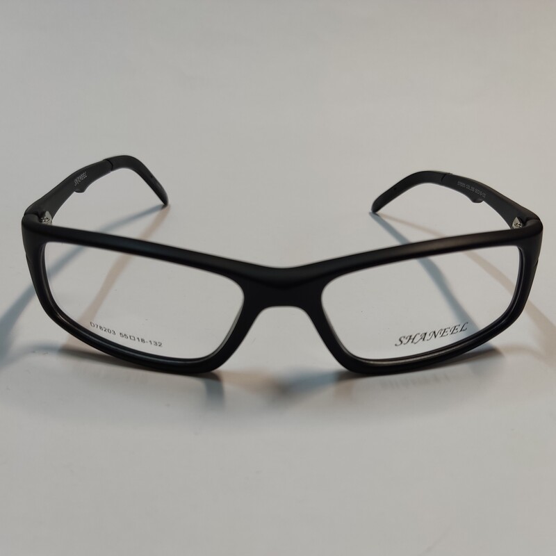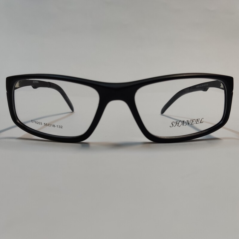 فریم عینک طبی shaneel D78203 با فریم کایوچویی مشکی مات و دسته های لولا فلزی ساده با روکش انتهای دسته(پشت گوش) نرم با سایز 55*18*132 و ارتفاع عدسی حدود 32 و قسمت جلوی فریم از دسته تا دسته در محدوده لولا 137 میباشد.