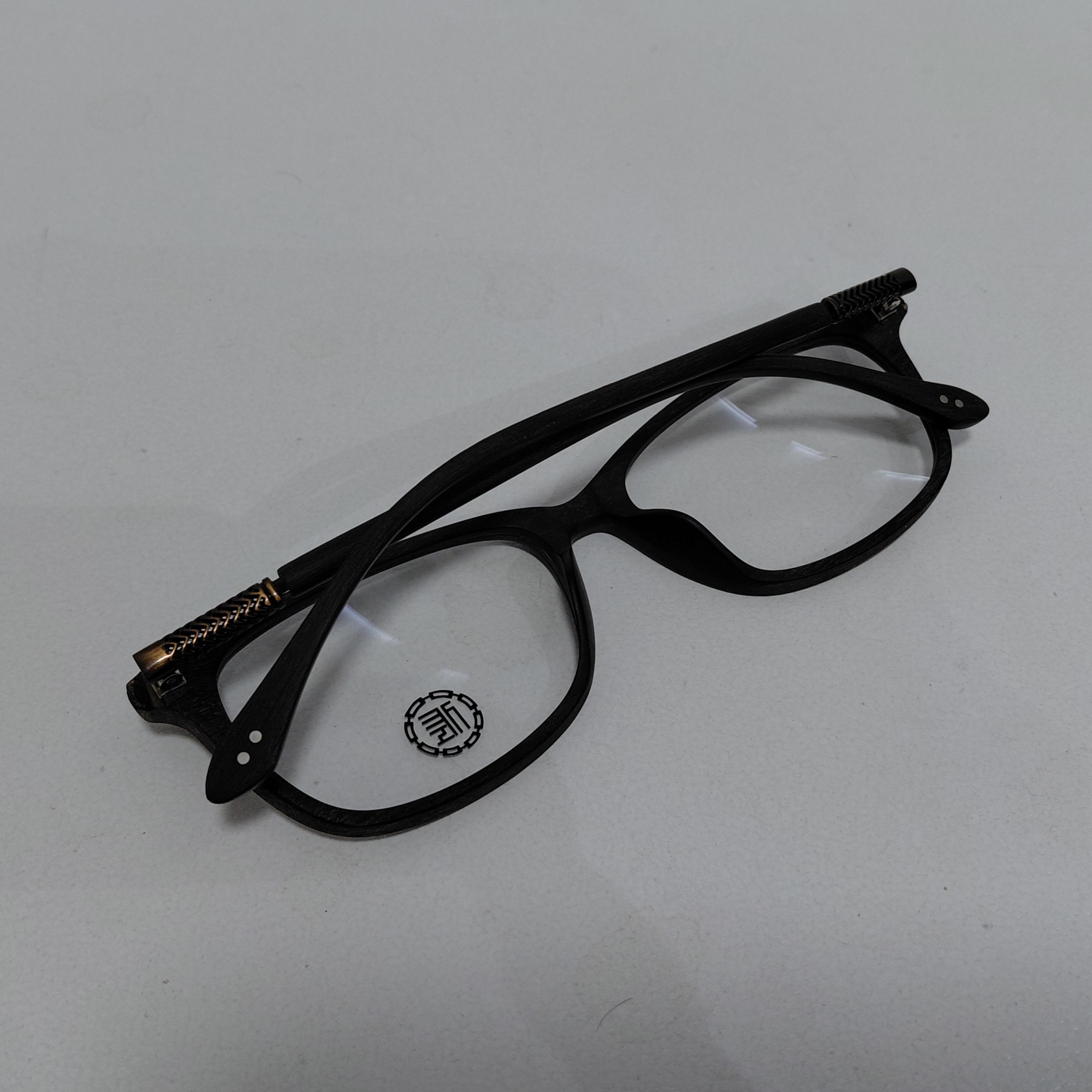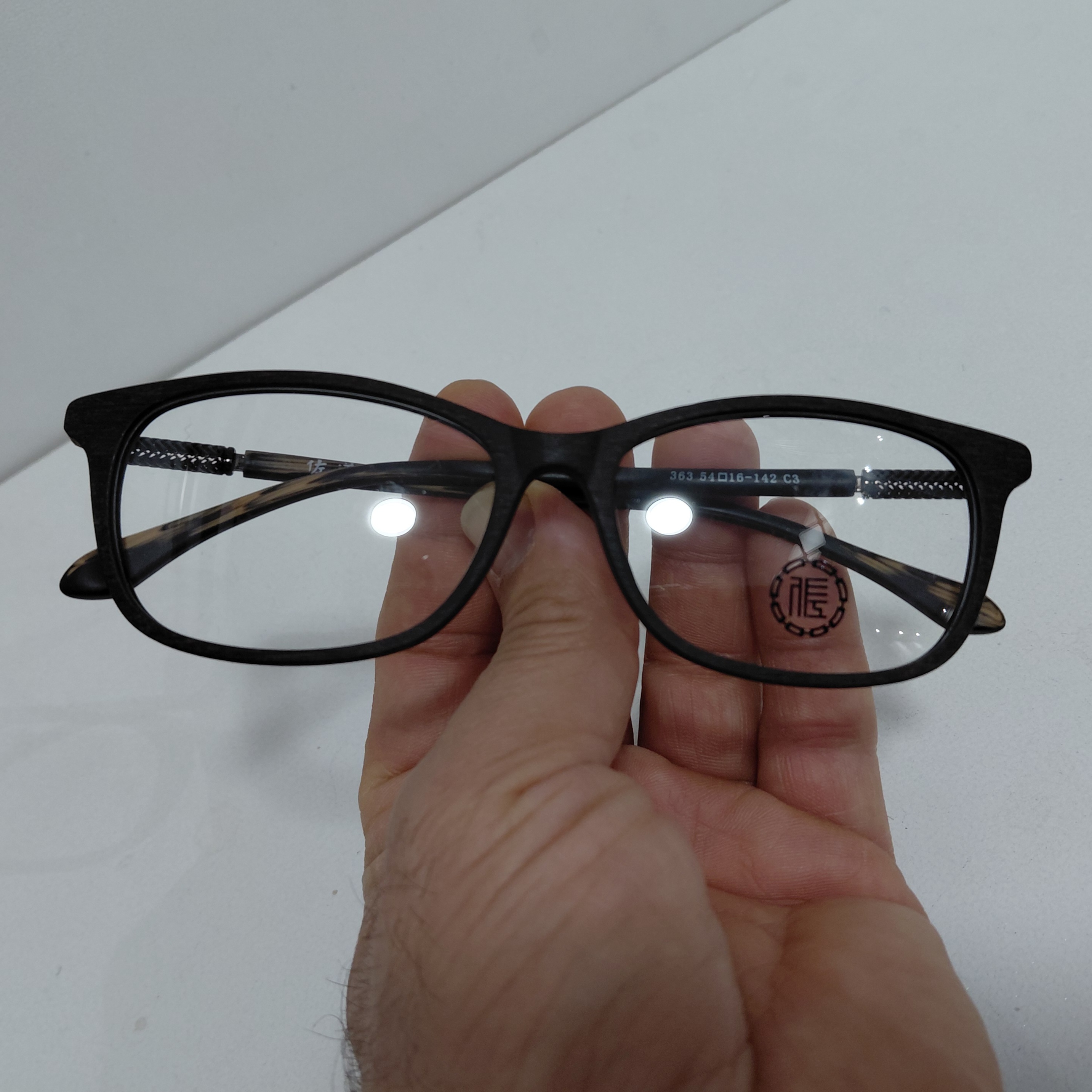 فریم عینک طبی طرح چوب با سایز 54*16*142 که قسمت جلوی فریم از دسته تا دسته حدود 142 و ارتفاع عدسی حدود 37 بوده و دسته ها دارای لولا فلزی ساده است.