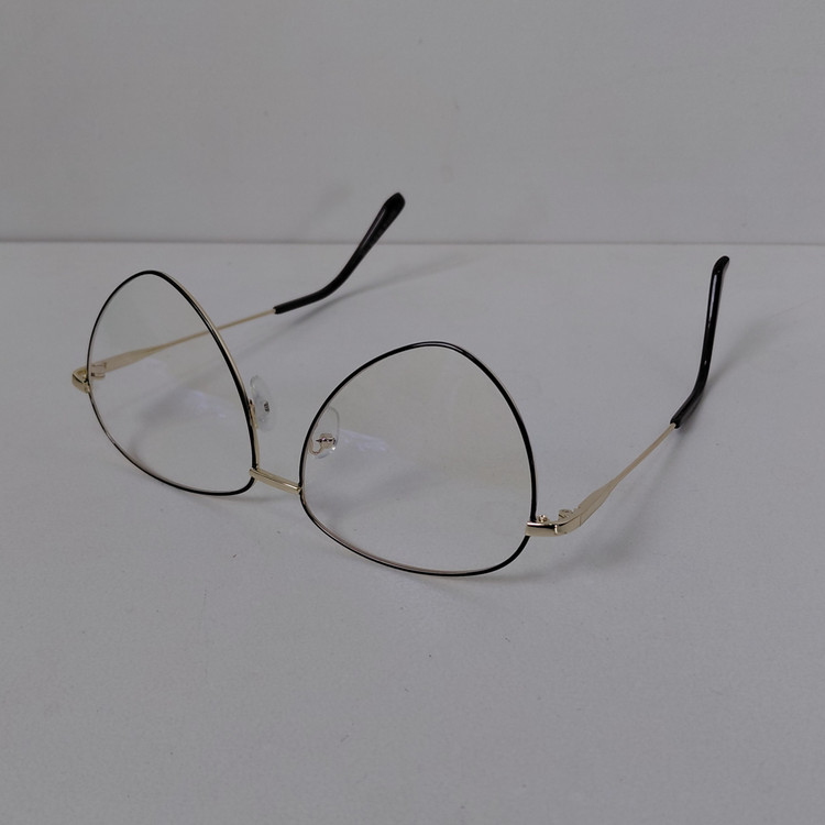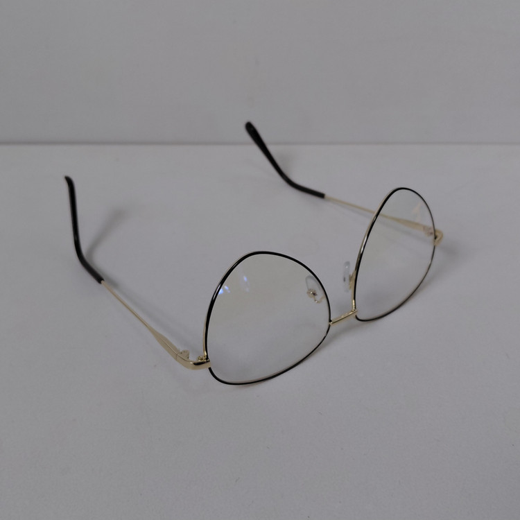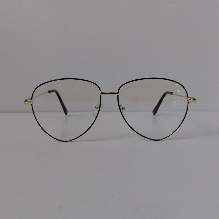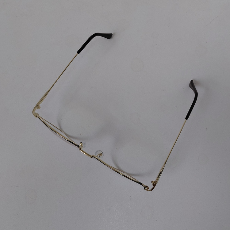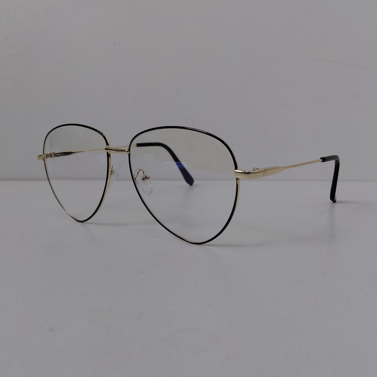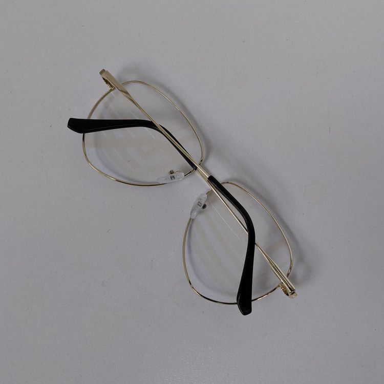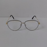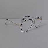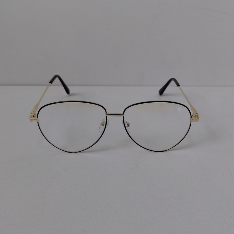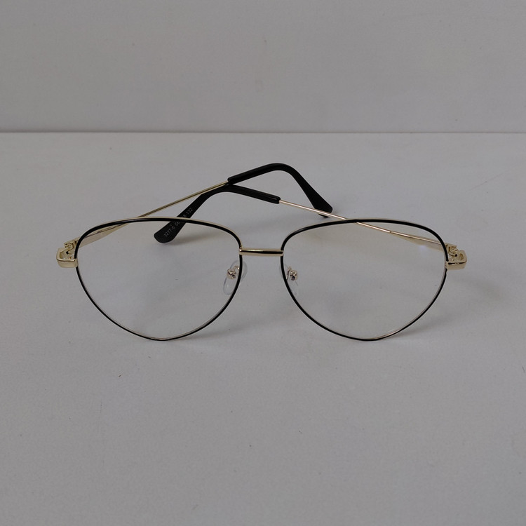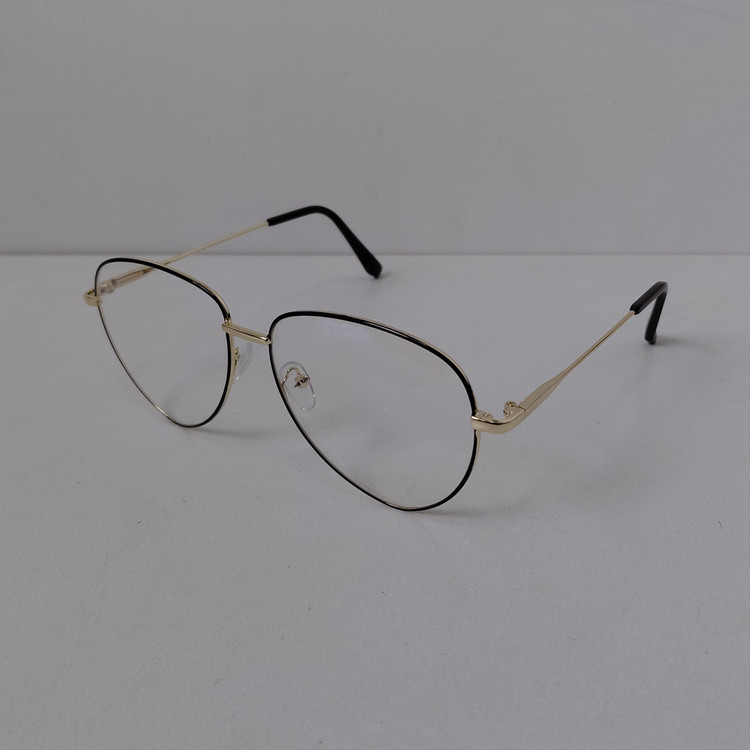 عینک با فریم مدل خلبانی به رنگ طلایی که دور قاب عدسی از بیرون مشکی بوده و دسته ها با لولا ساده و سایز روی عینک 56*18*132 درج شده است.