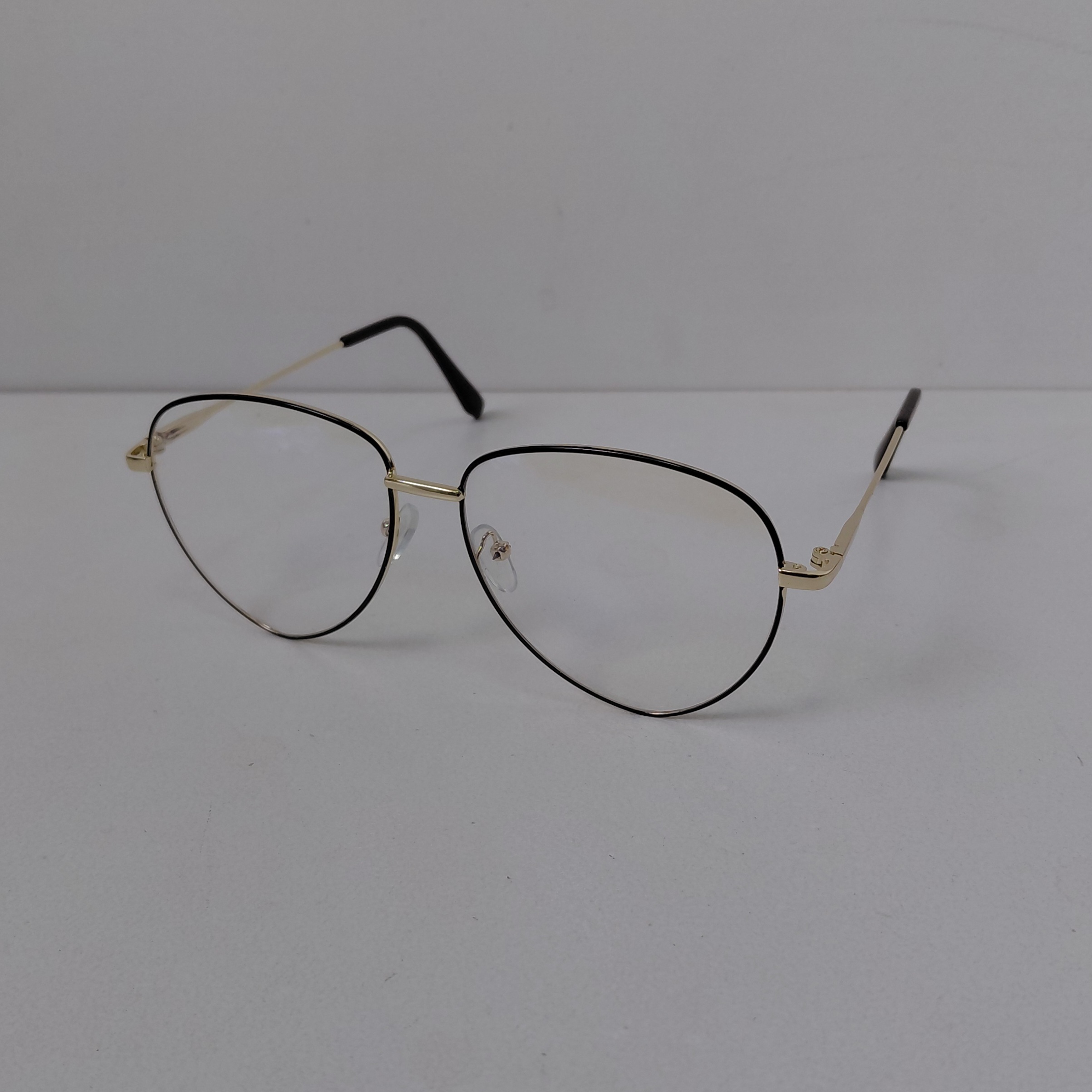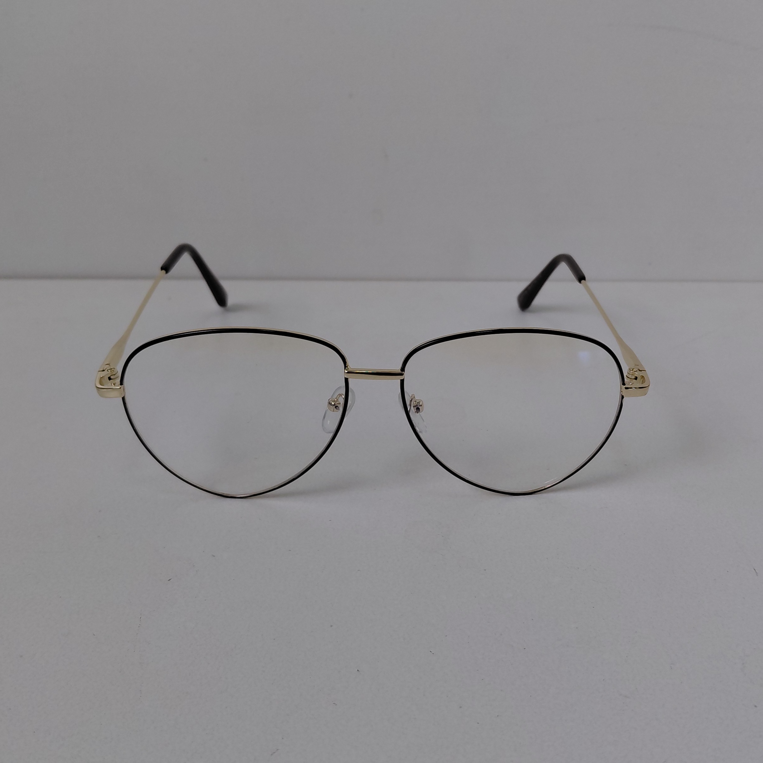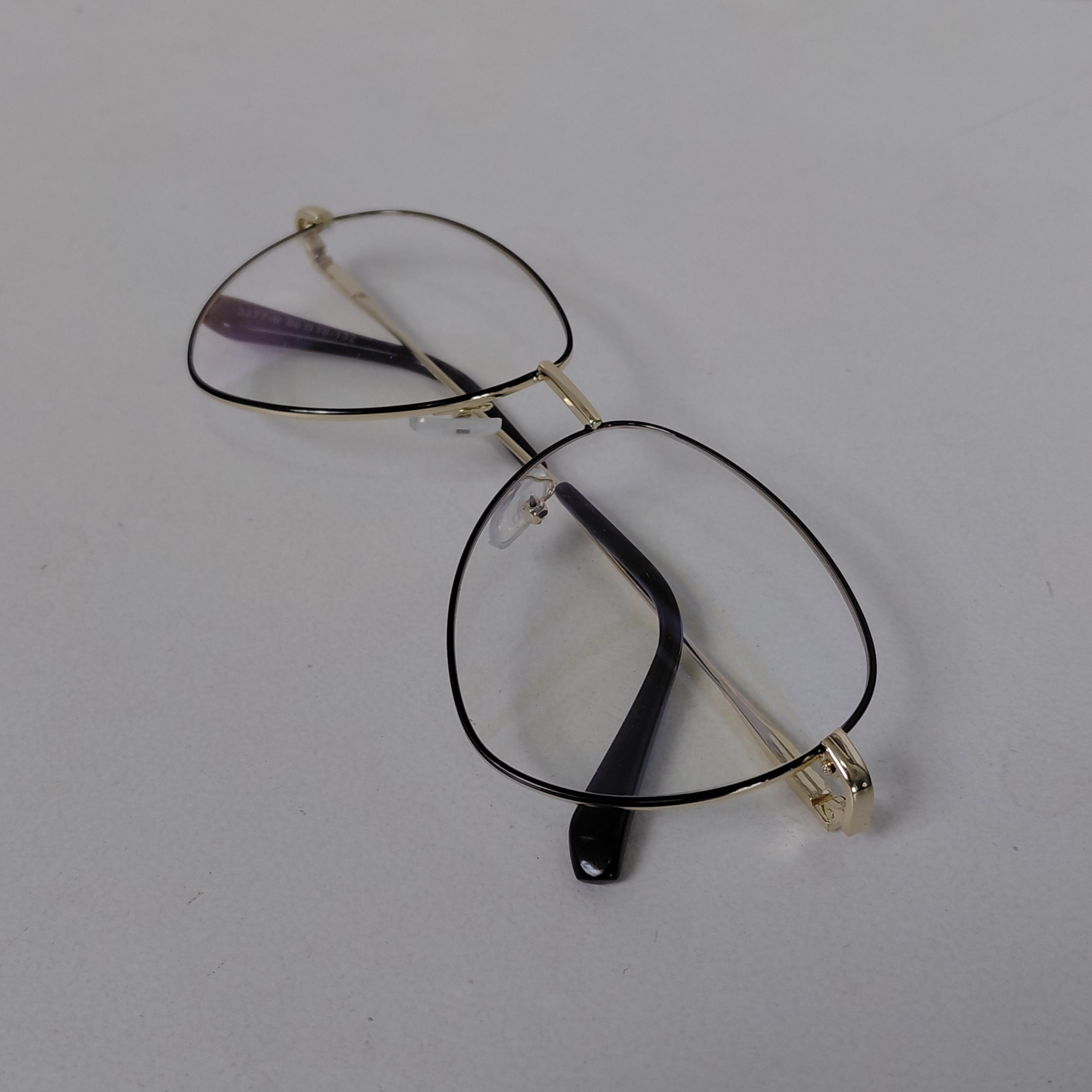 عینک با فریم مدل خلبانی به رنگ طلایی که دور قاب عدسی از بیرون مشکی بوده و دسته ها با لولا ساده و سایز روی عینک 56*18*132 درج شده است.
