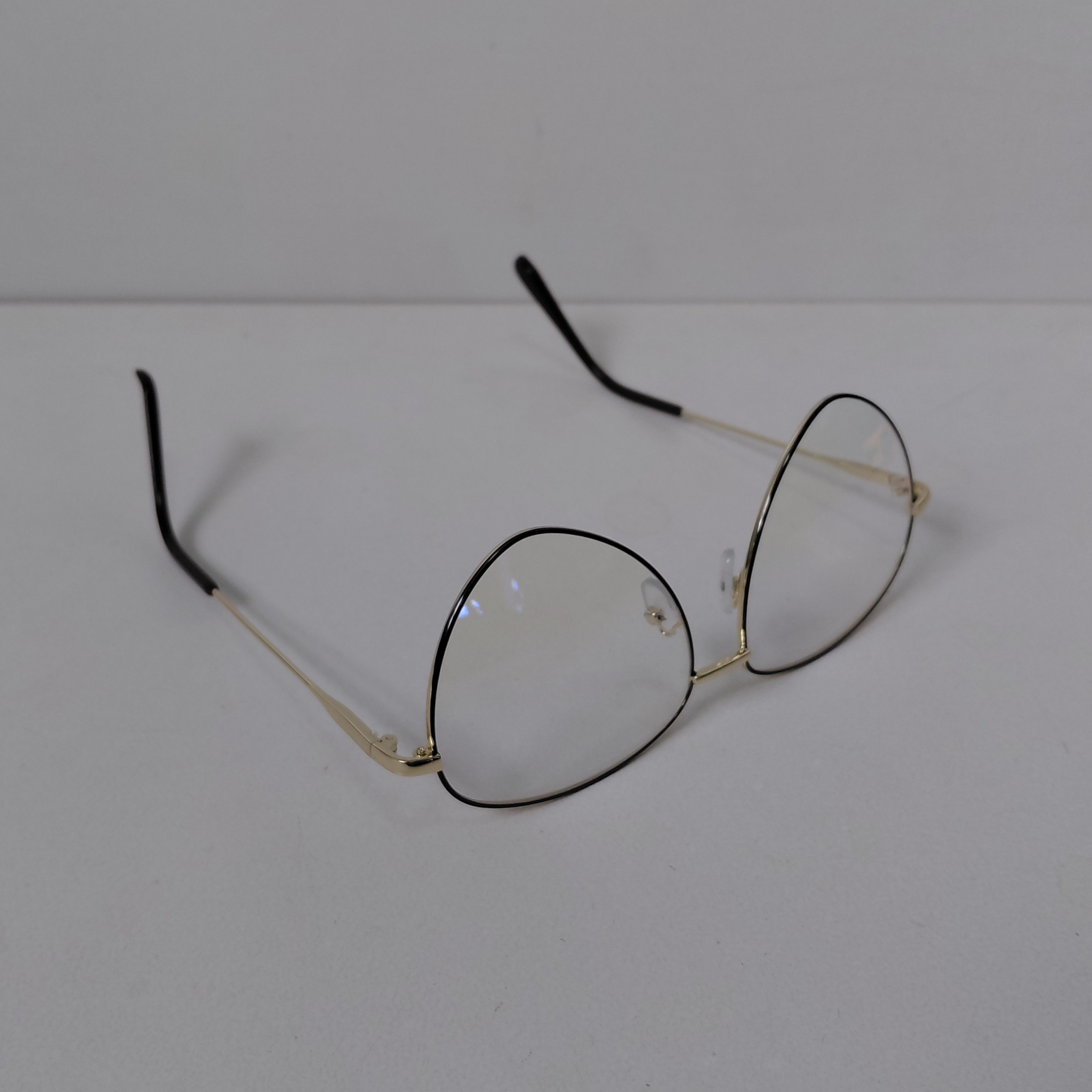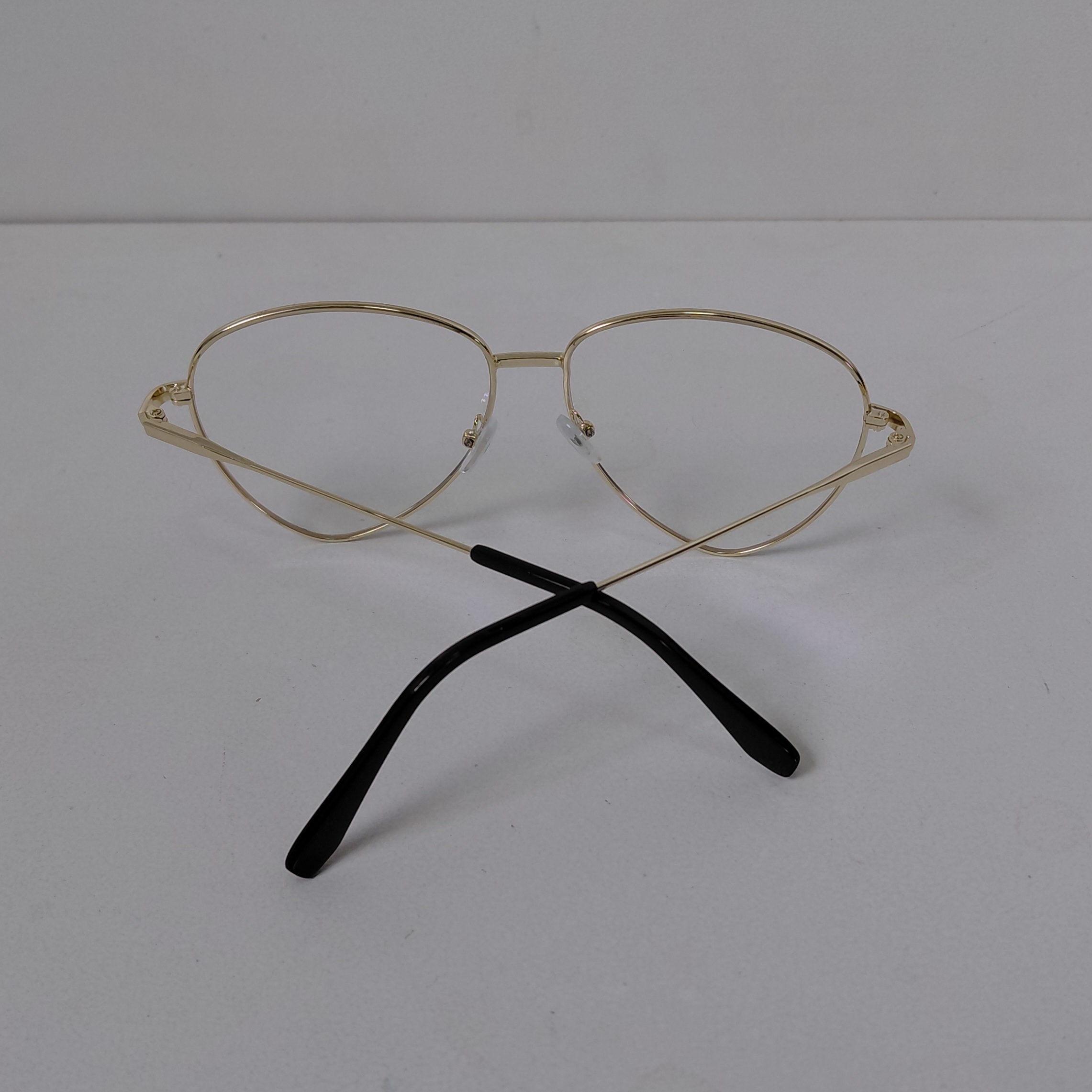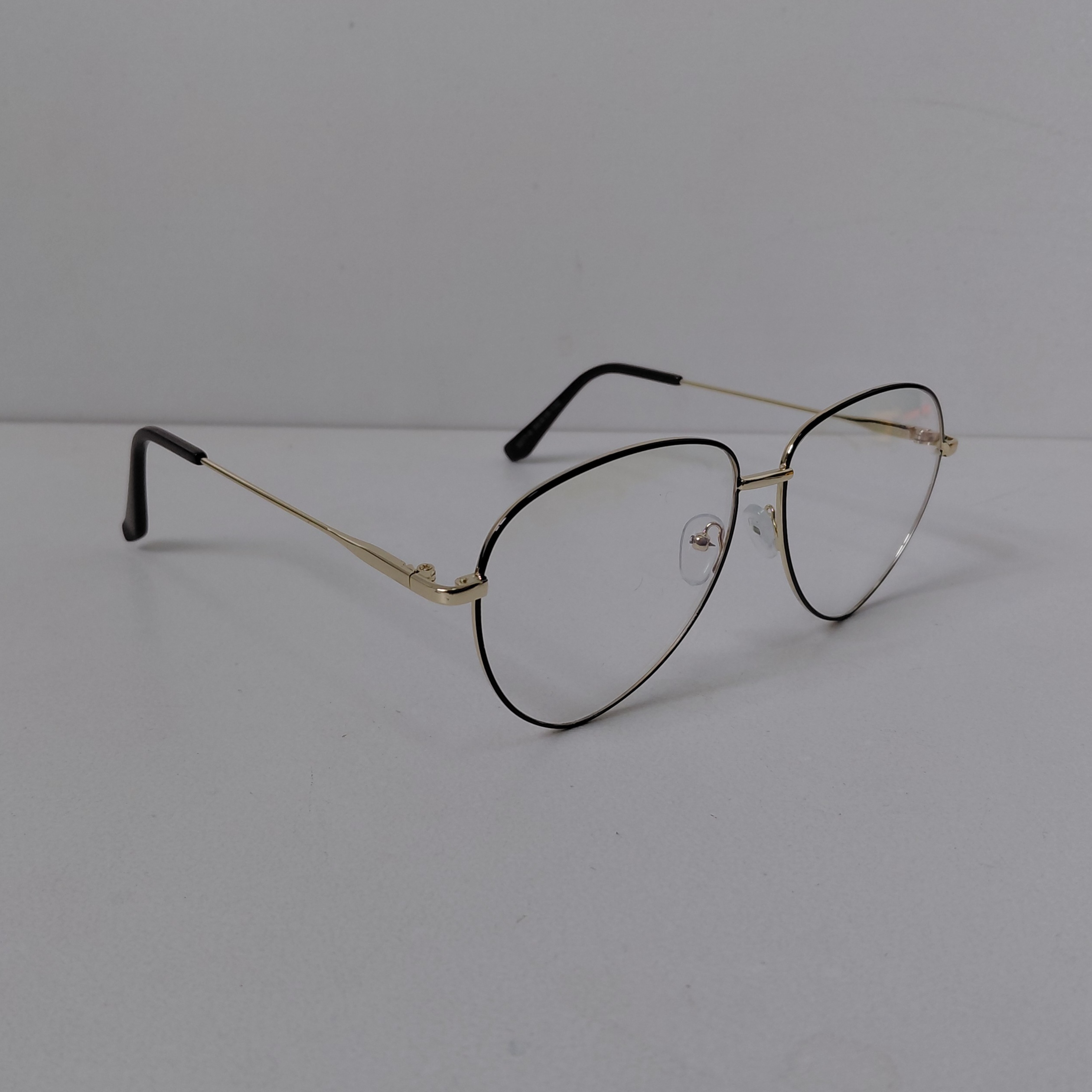 عینک با فریم مدل خلبانی به رنگ طلایی که دور قاب عدسی از بیرون مشکی بوده و دسته ها با لولا ساده و سایز روی عینک 56*18*132 درج شده است.