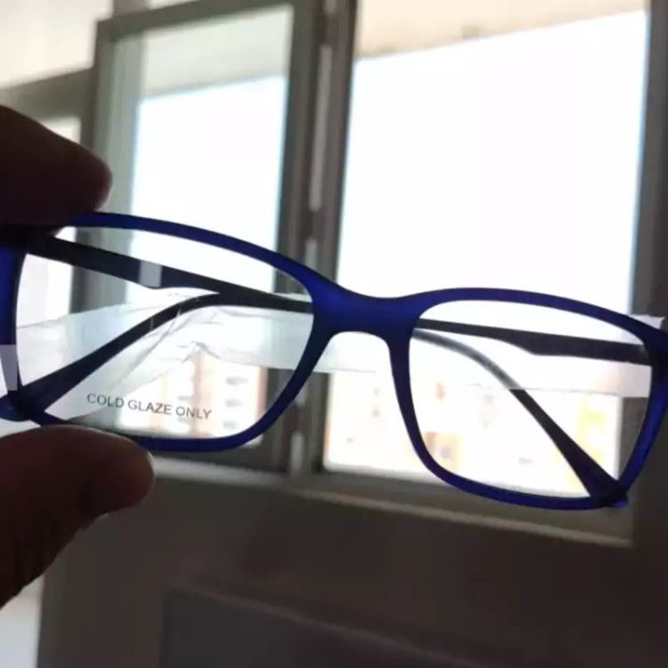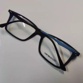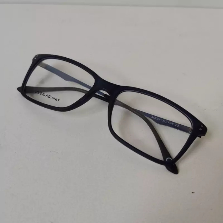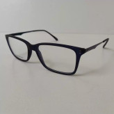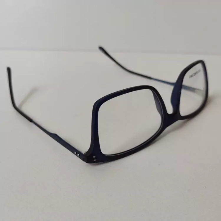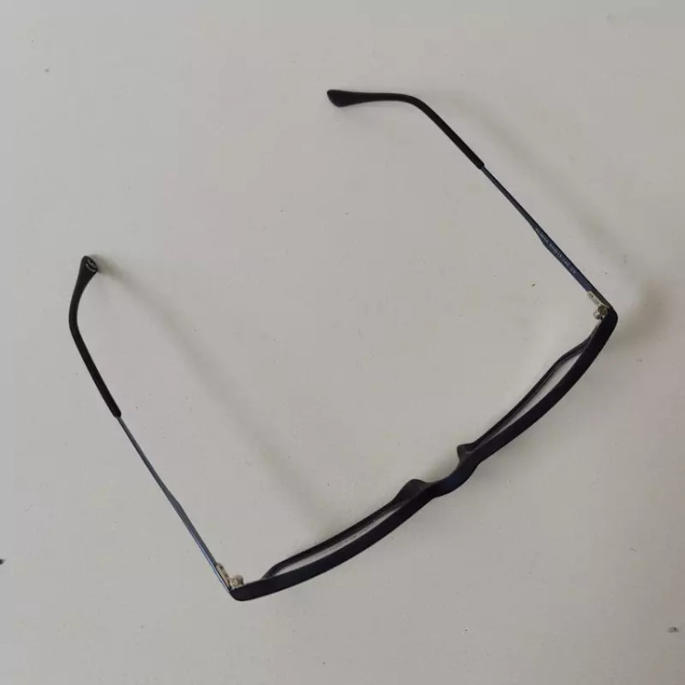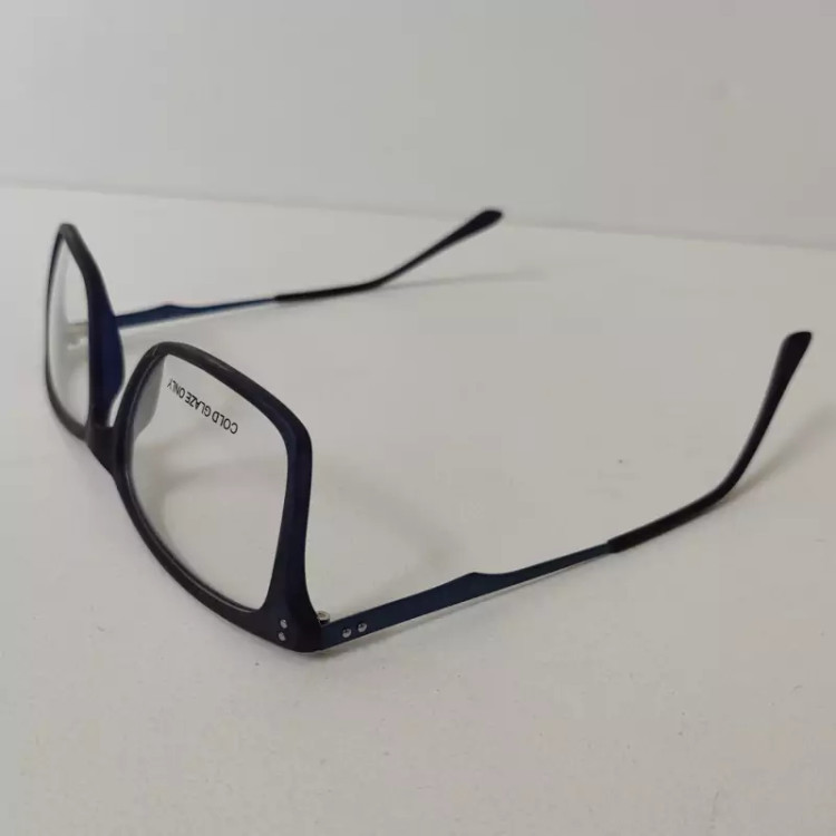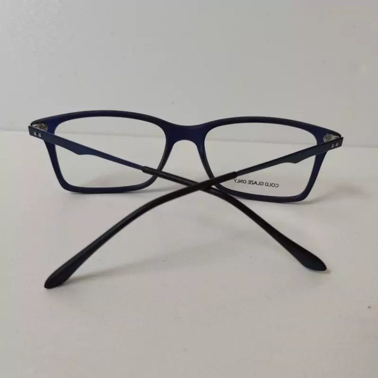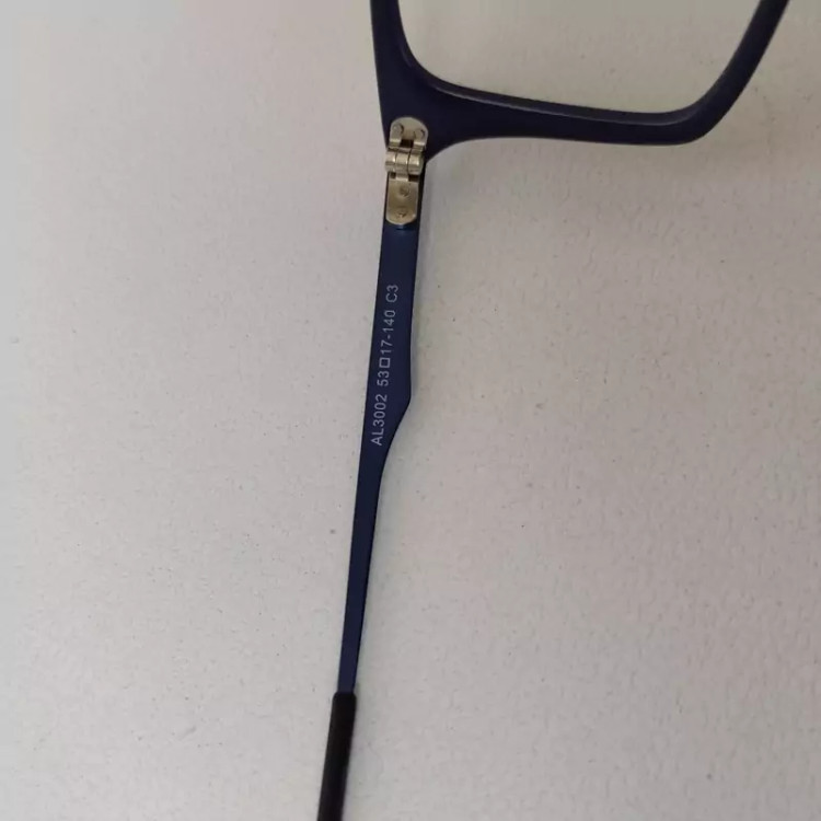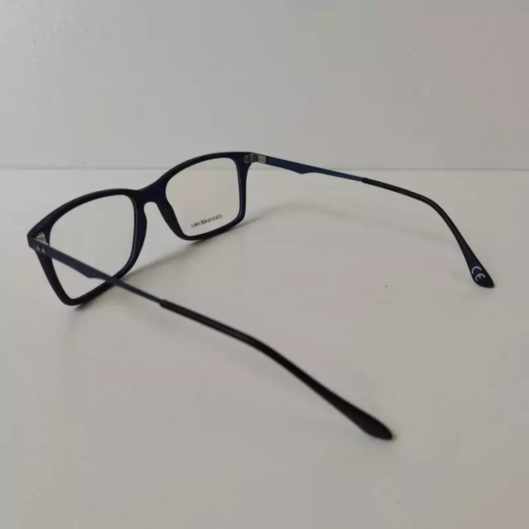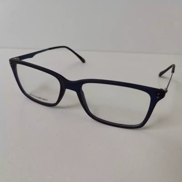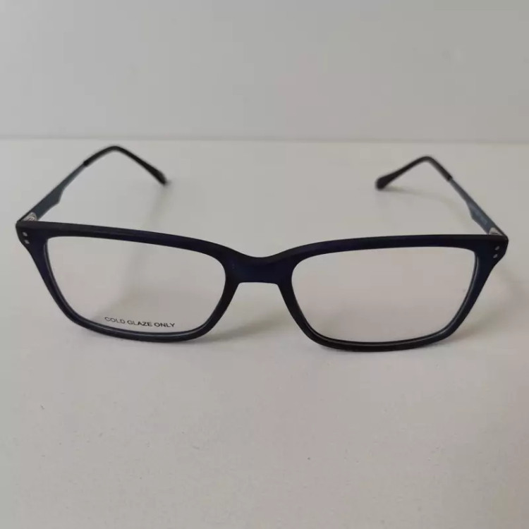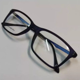 فریم عینک طبی با فریم کائوچویی آبی کاربنی تیره و دسته فلزی ظریف به رنگ آبی با لولا ساده بوده و عینک بسیار شیک و سبک است.
