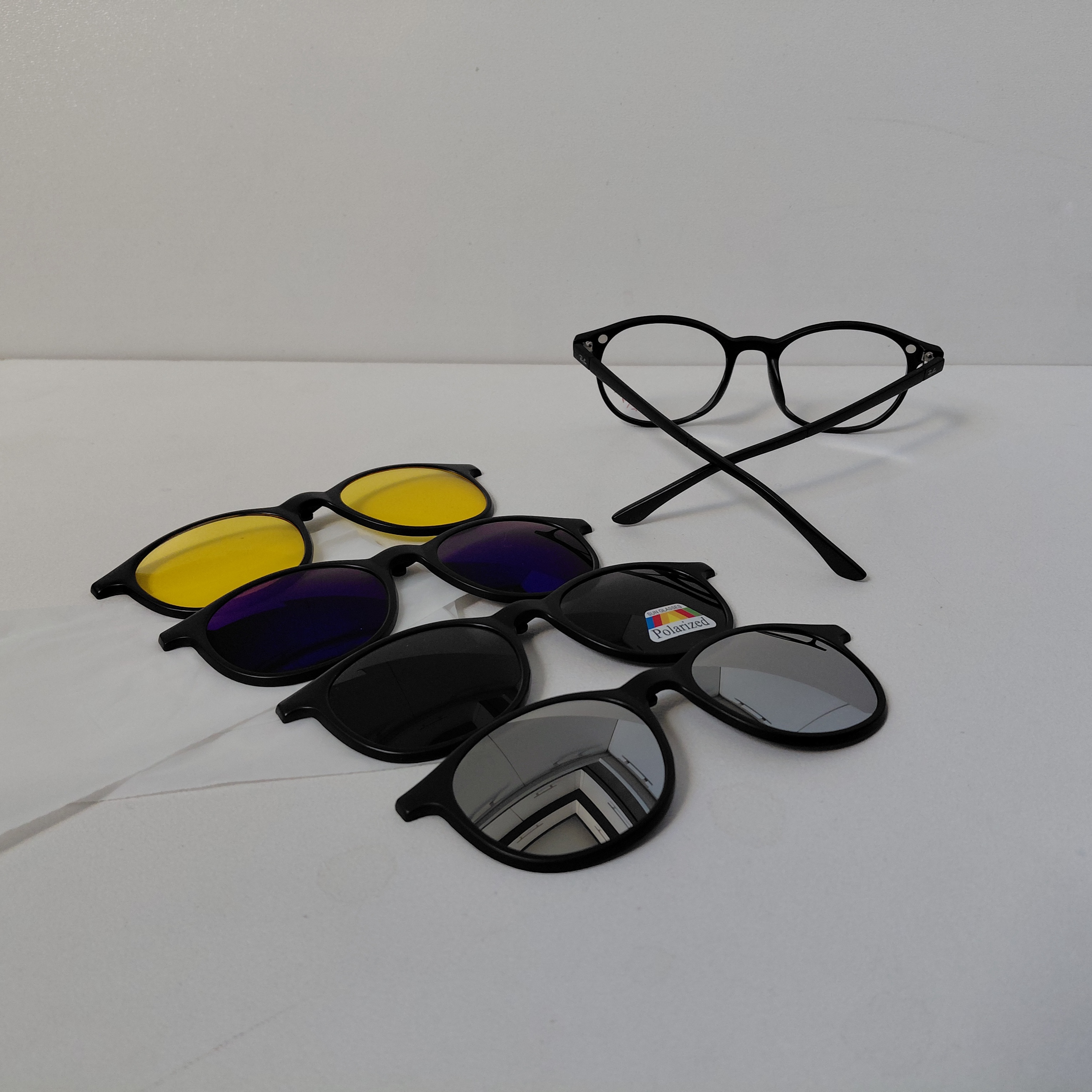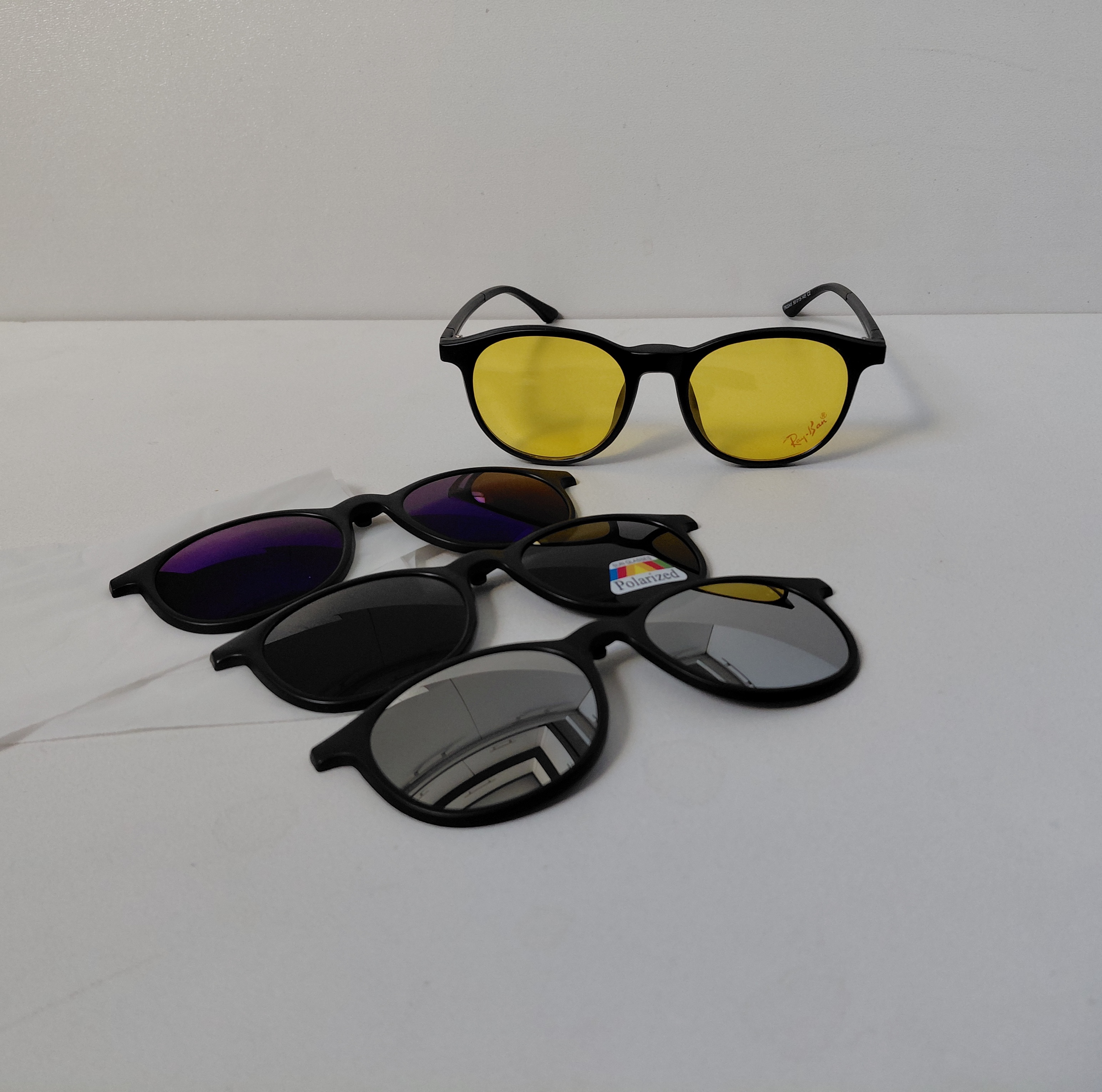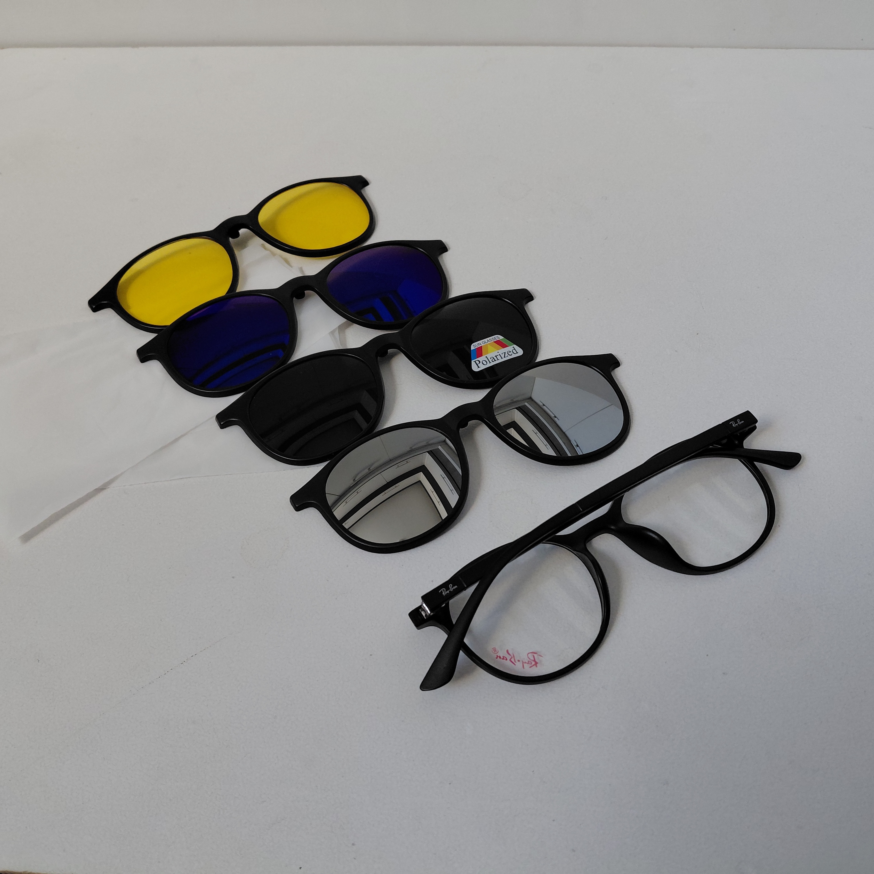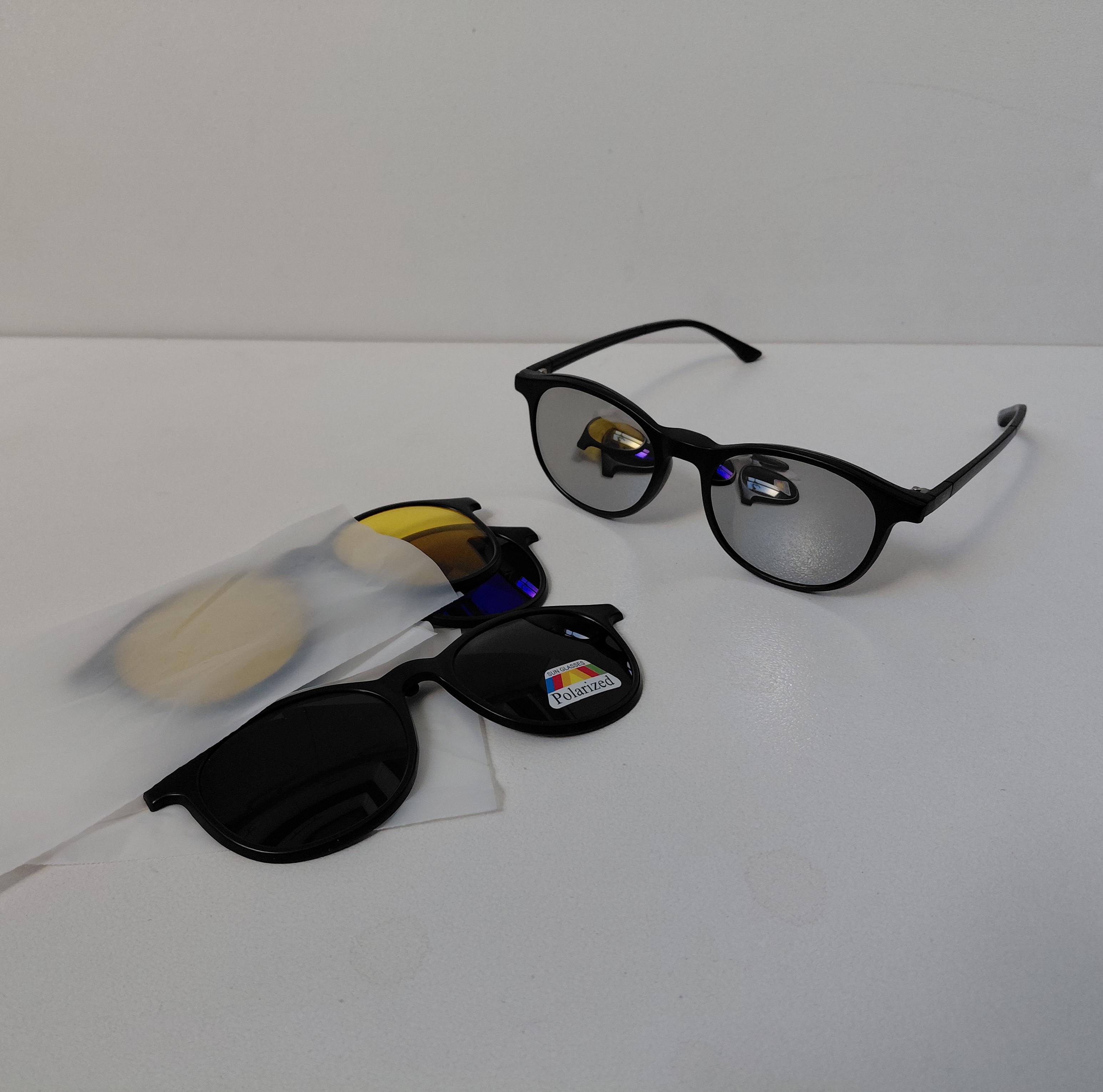 فریم عینک طبی کاور دار با 4 کاور آفتابی که 1.کاور دودی پلاریزه بوده 2.کاور شب مناسب استفاده شب 3. کاور آبی رفلکس 4.کاور نقره ای رفلکس مناسب روزهای آفتابی و برفی