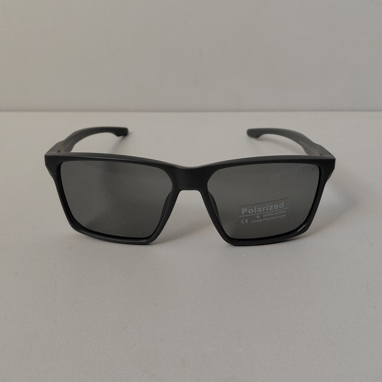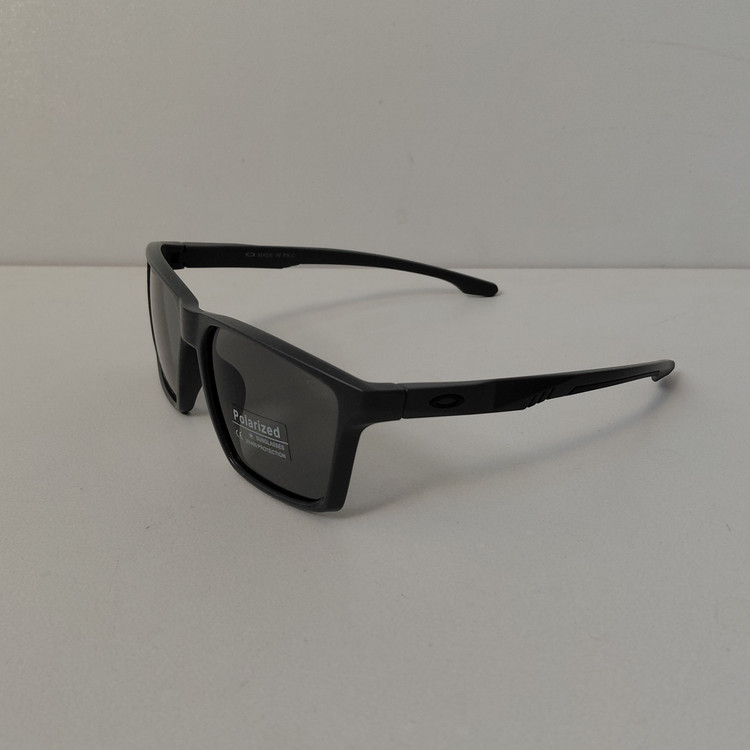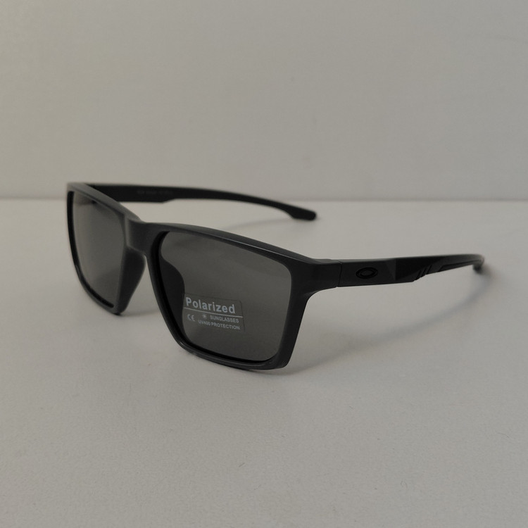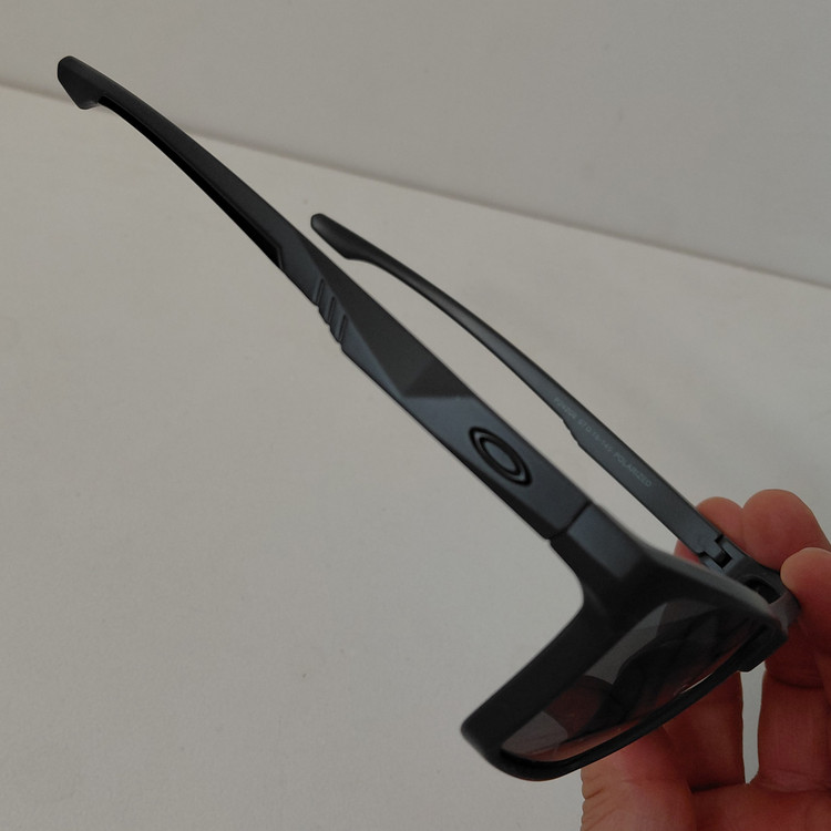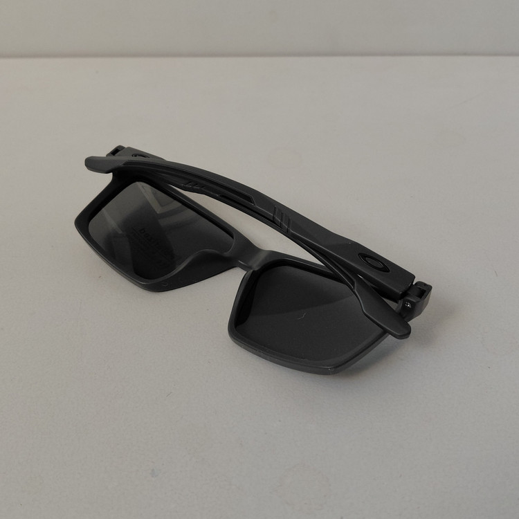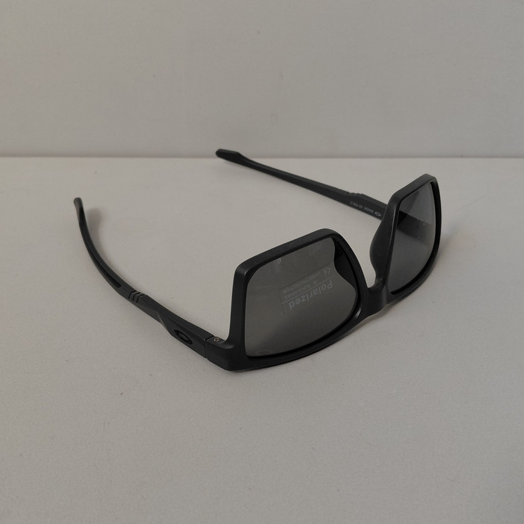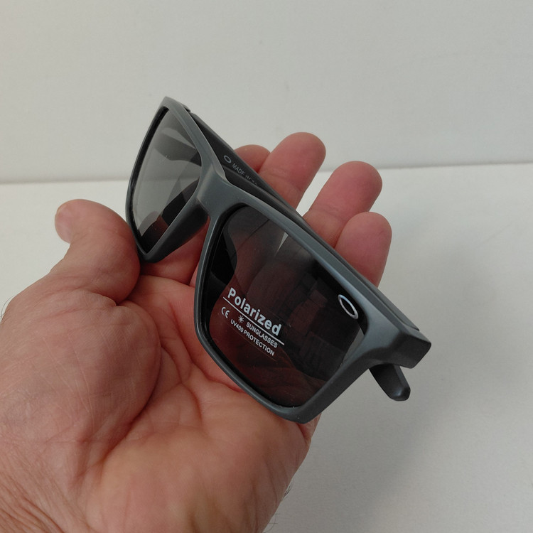 عینک آفتابی ورزشی اوکلی با فریم طوسی و عدسی پلاریزه و سایز 145*17*56 که قسمت جلوی عینک از دسته تا دسته حدود 140 و ارتفاع عدسی حدود 41 میباشد.