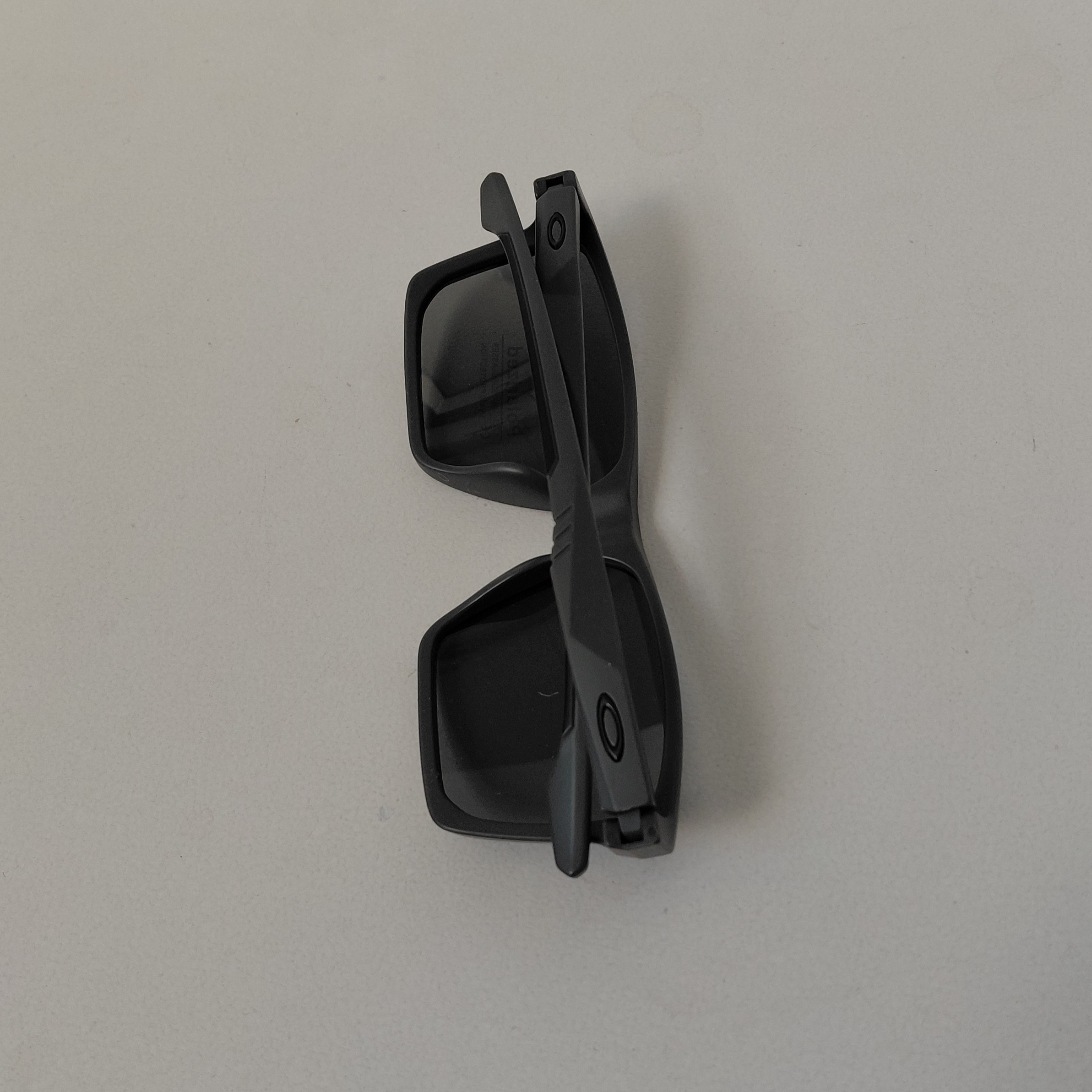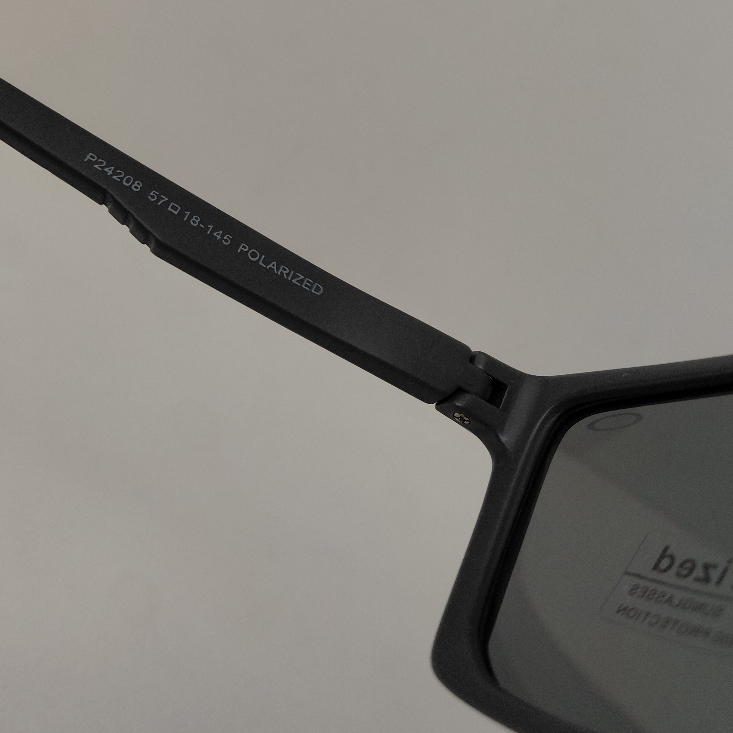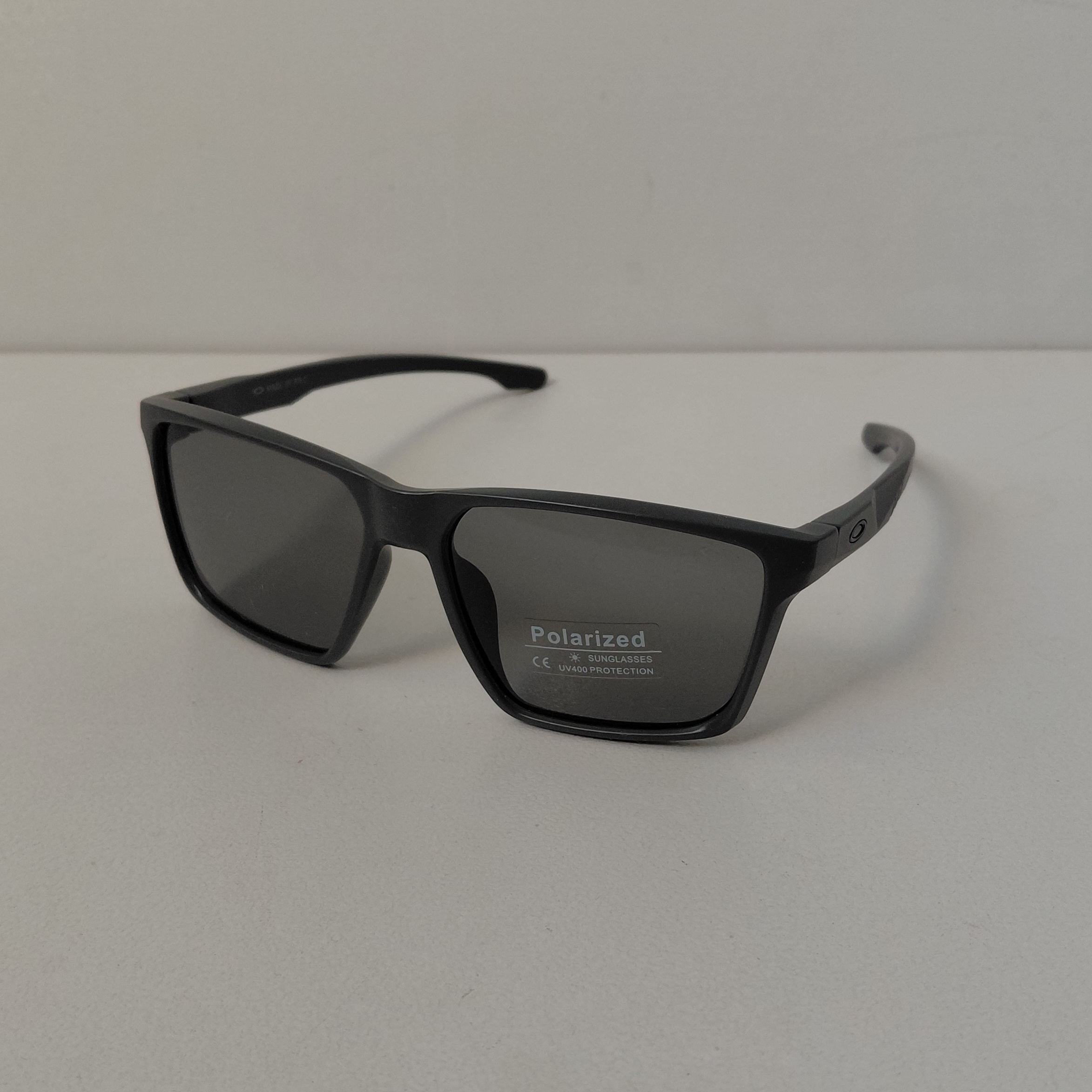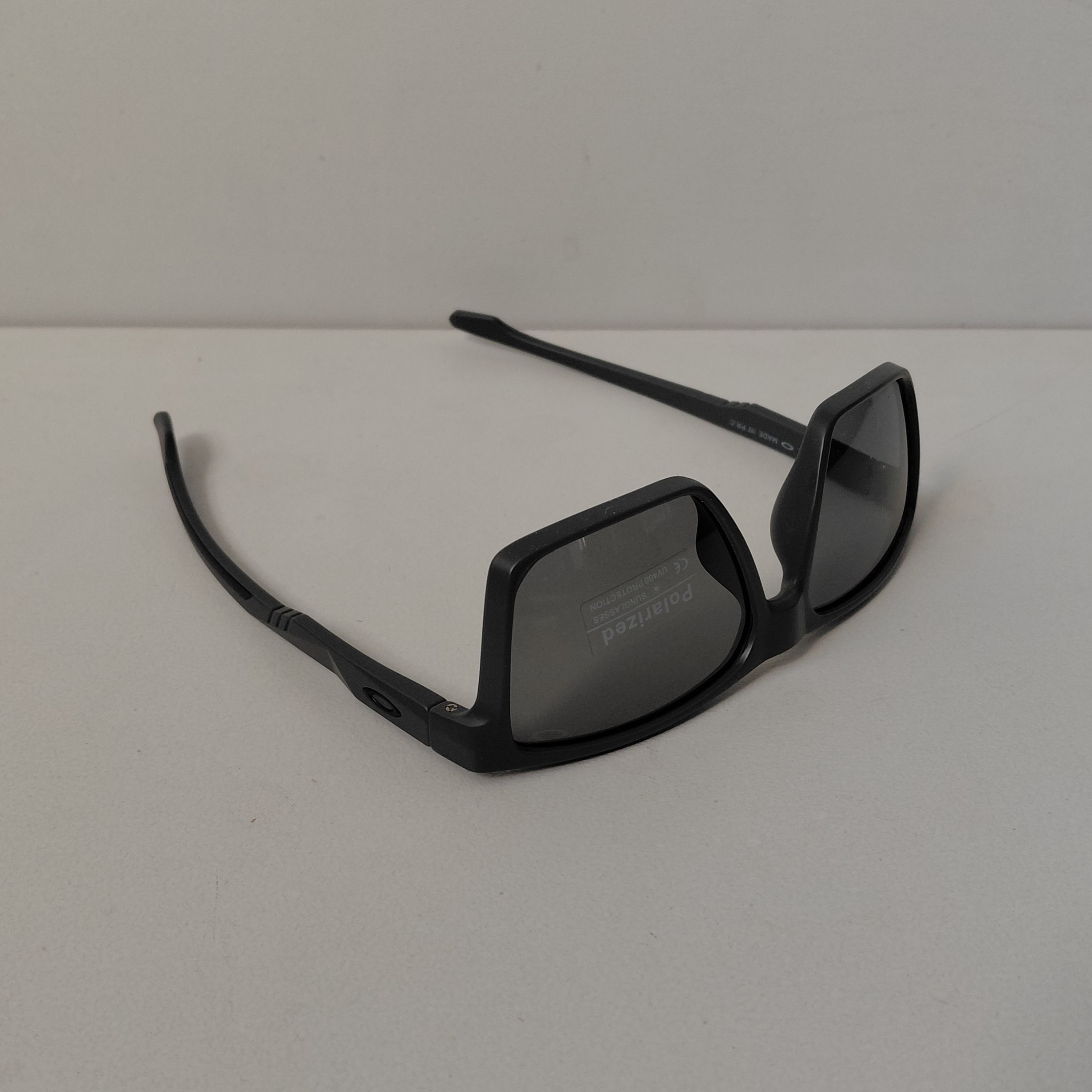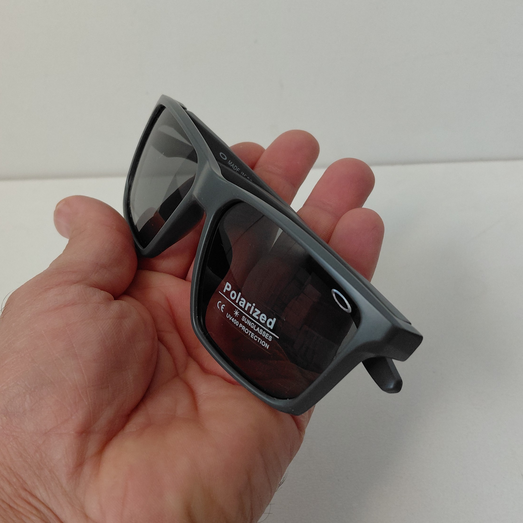 عینک آفتابی ورزشی اوکلی با فریم طوسی و عدسی پلاریزه و سایز 145*17*56 که قسمت جلوی عینک از دسته تا دسته حدود 140 و ارتفاع عدسی حدود 41 میباشد.