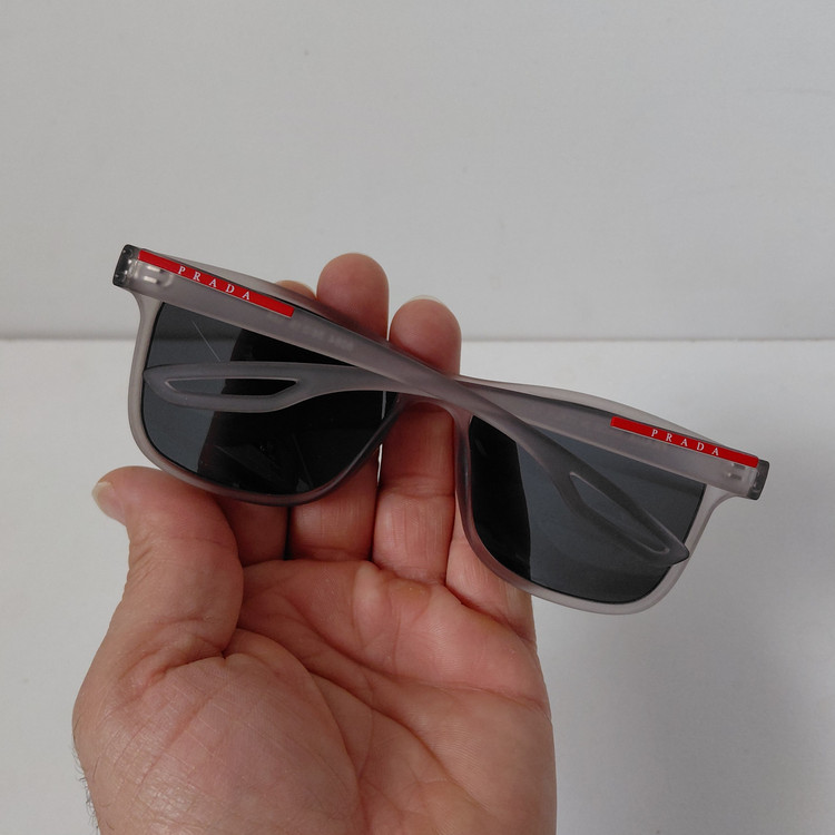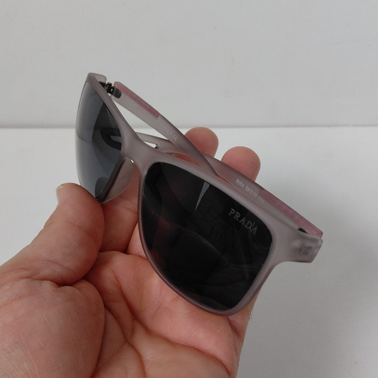 عینک آفتابی پرادا با فریم طوسی مناسب استفاده زنانه و مردانه با سایز 134*19*56 که قسمت جلوی فریم از دسته تا دسته حدود 144 میلیمتر و ارتفاع عدسی حدود 45 میباشد.