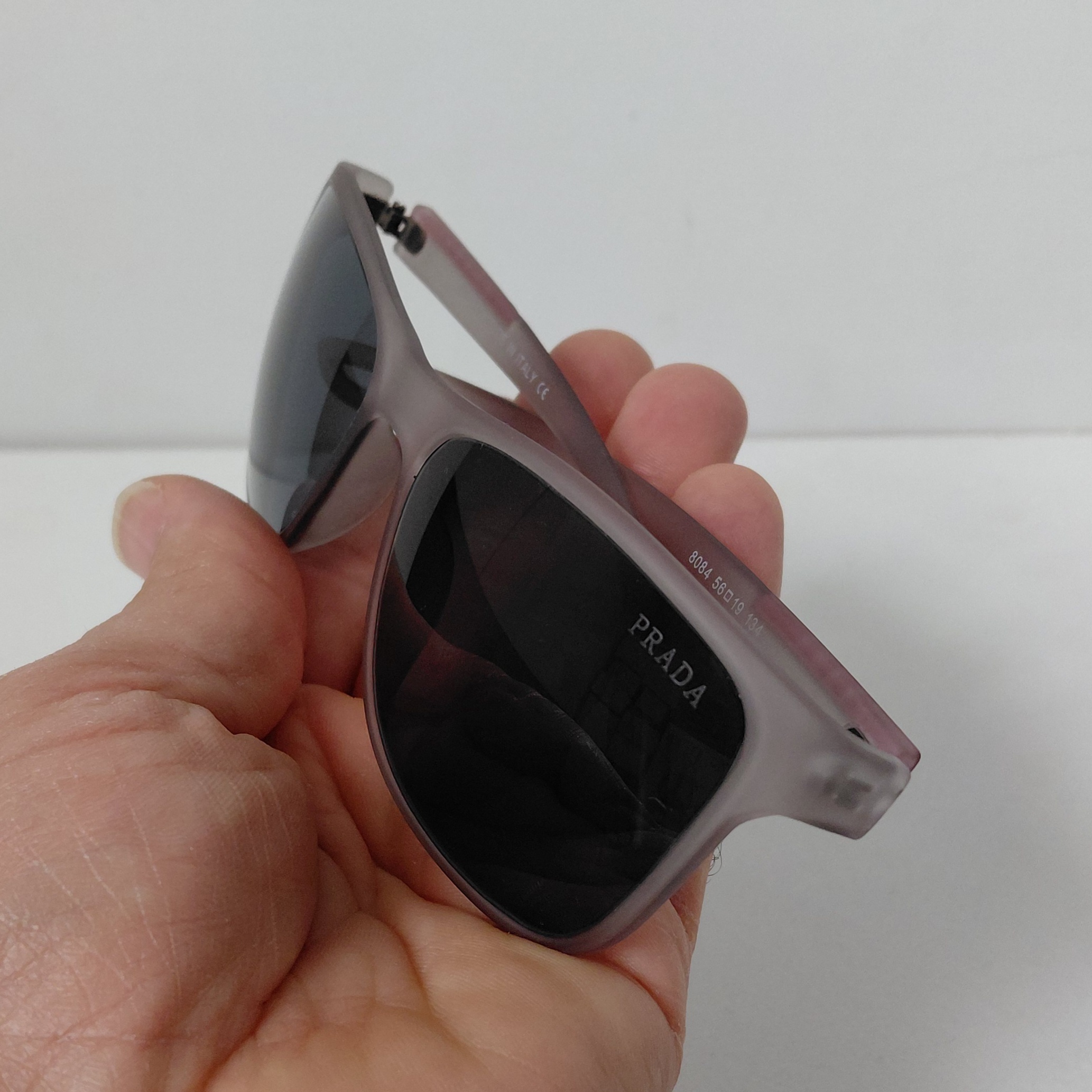 عینک آفتابی پرادا با فریم طوسی مناسب استفاده زنانه و مردانه با سایز 134*19*56 که قسمت جلوی فریم از دسته تا دسته حدود 144 میلیمتر و ارتفاع عدسی حدود 45 میباشد.